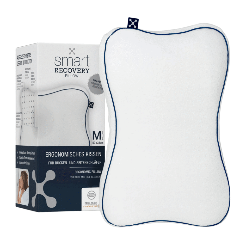 Das SmartSleep Recovery Pillow kombiniert eine ergonomisch geformte Nackenmulde mit hochwertigem CosyPur®-Memory-Foam von BASF. Durch integrierte Lüftungskanäle im Schaum wird die Luftzirkulation verbessert, wodurch sich das Kissen auch bei wärmeren Temperaturen angenehm frisch anfühlt. Der Bezug besteht aus einer Baumwoll-Viskose-Mischung, die sich weich auf der Haut anfühlt und bei 40 °C waschbar ist.